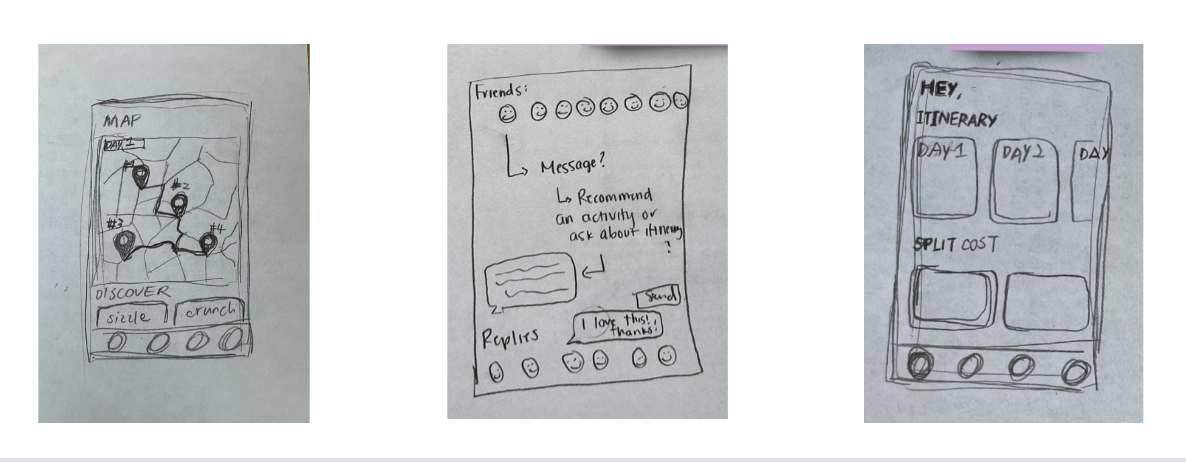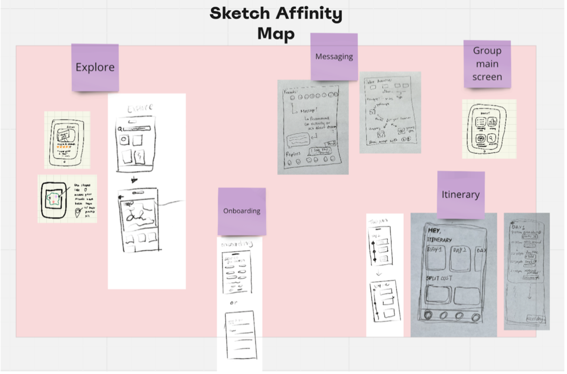 After selecting the best 3 sketches from our mini design sprint activity, we decided that it would be best to still consider all designs and sketches that were made. Moreover, we decided to create an affinity diagram for all of our sketches into different groups, which were Explore, Messaging, Onboarding, Itinerary, and Group Main Screen, as shown below.