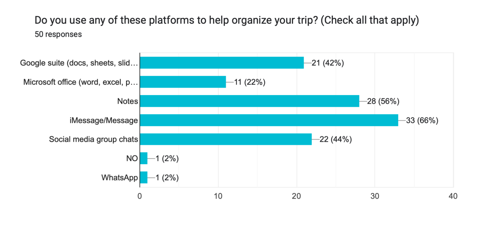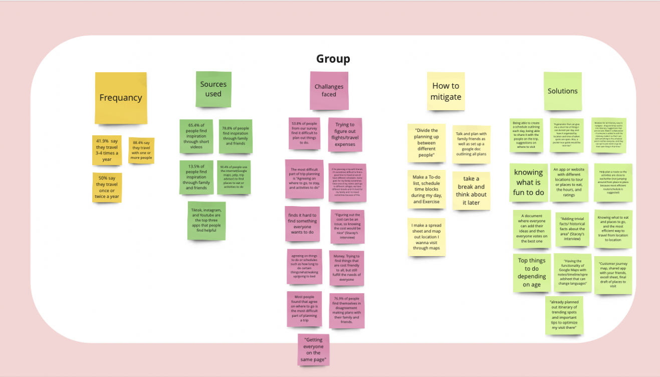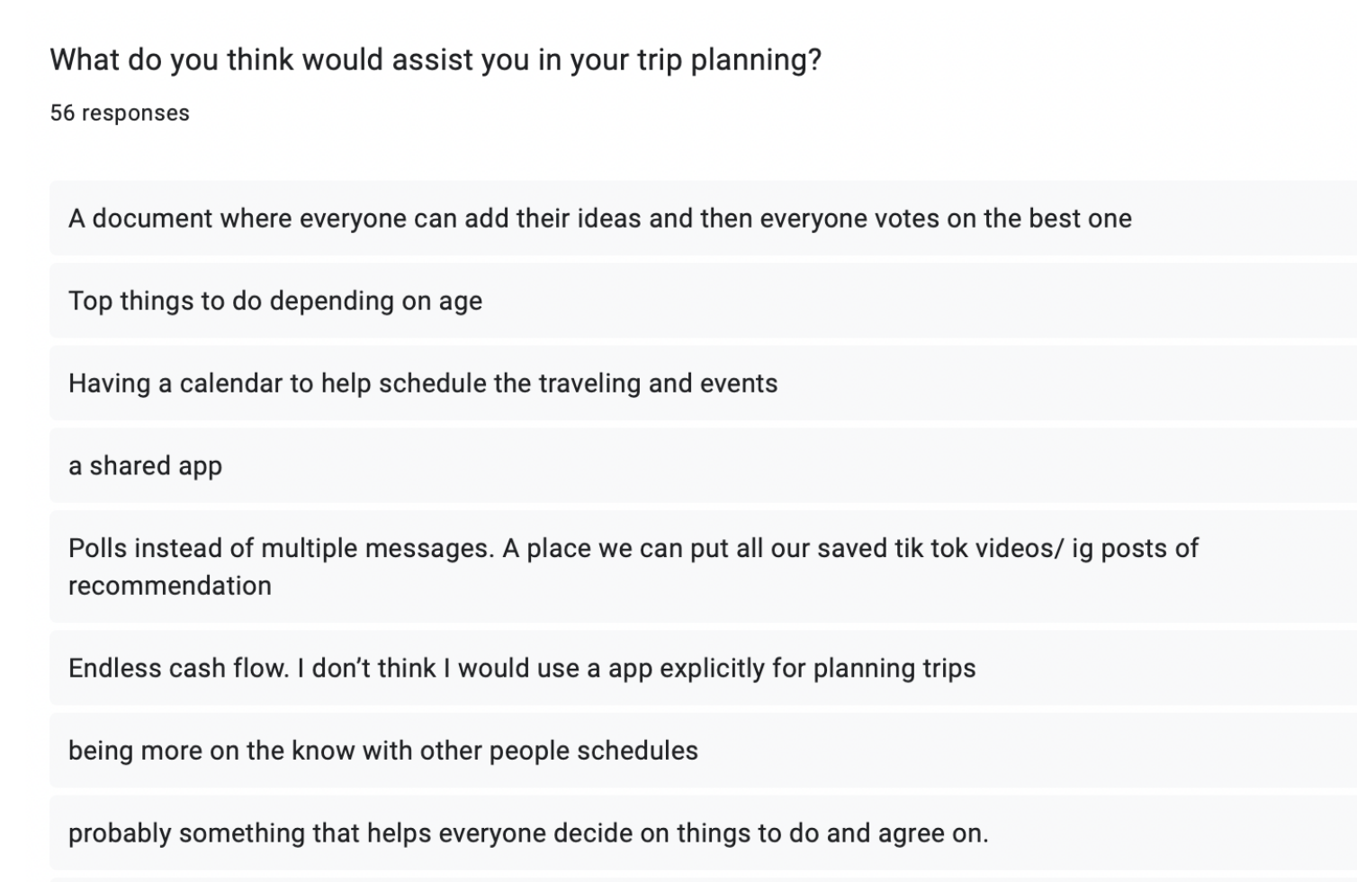 In the beginning stages of our research, we came to the conclusion that recieving feedback through surveys and interviews allow us to understand the pain points of the user in regards to trip planning, and how it can be more convenient and efficient.
